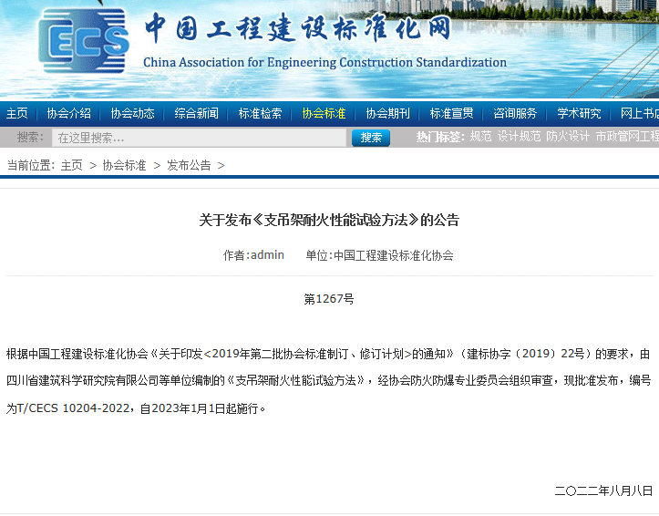 根據(jù)中國(guó)工程建設(shè)標(biāo)準(zhǔn)化協(xié)會(huì)《關(guān)于印發(fā)<2019年第二批協(xié)會(huì)標(biāo)準(zhǔn)制訂、修訂計(jì)劃>的通知》(建標(biāo)協(xié)字〔2019〕22號(hào))的要求,由四川省建筑科學(xué)研究院有限公司等單位編制的《支吊架耐火性能試驗(yàn)方法》,經(jīng)協(xié)會(huì)防火防爆專業(yè)委員會(huì)組織審查,現(xiàn)批準(zhǔn)發(fā)布,編號(hào)為T/CECS 10204-2022,自2023年1月1日起施行。