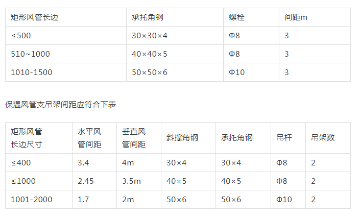 (4)支吊架不得安裝在風口、閥門、檢查孔等處,以免影響操作。吊架不得直接吊在風管法蘭上。支吊架的間距按設計要求進行,每隔3米設支吊架一個,風管垂直安裝時,間距不大于4m,但每根立管的固定件不少于2個。保溫風管支吊架必須在橫擔上襯墊外刷防火漆的硬木墊,木墊的厚度以風管保溫的厚度為準。