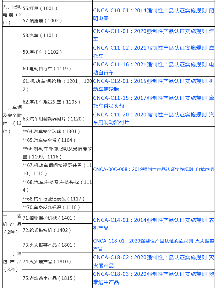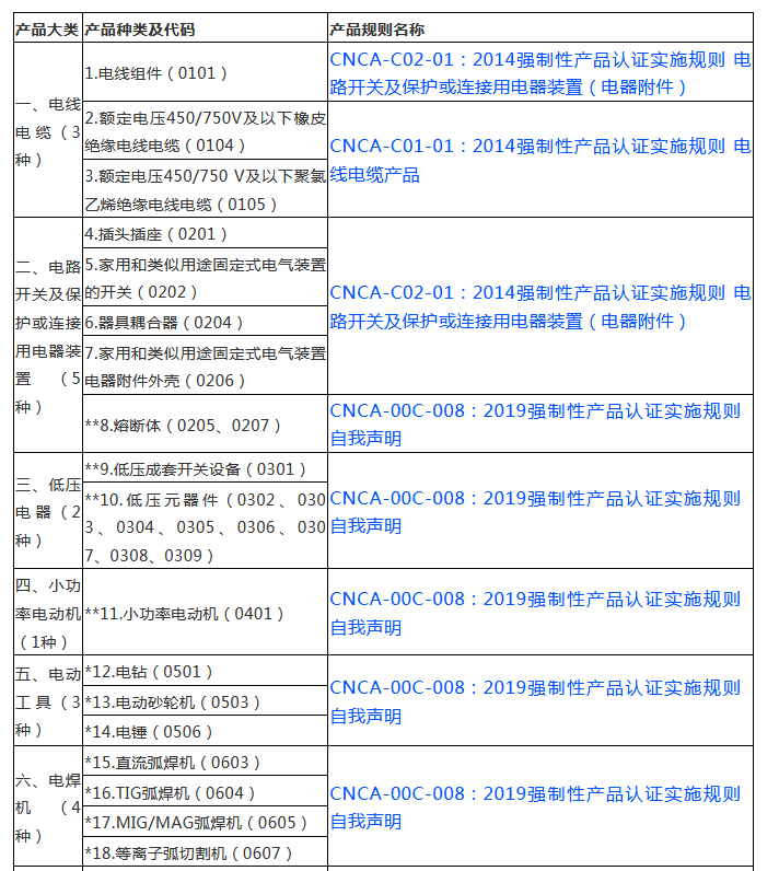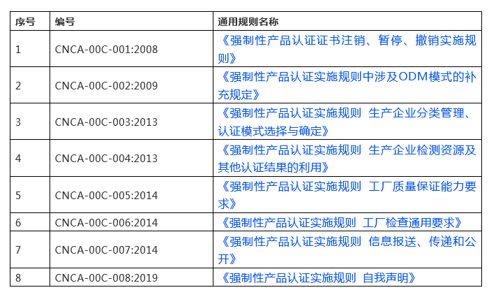 據(jù)國家認(rèn)證認(rèn)可監(jiān)督管理委員會(huì)(CNCA)官網(wǎng)公布的強(qiáng)制性產(chǎn)品認(rèn)證實(shí)施規(guī)則匯總,供大家參考。具體通用規(guī)則名稱和序號(hào)如下: